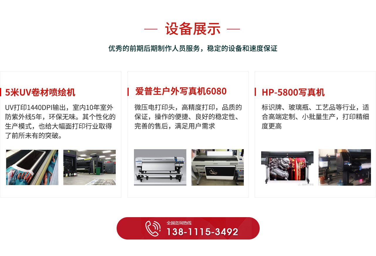 多臺5M3.2MUV打印設備,多臺愛普生HP打印設備,進口后道設備,全套多臺快速加工能力大廠房為批量加工奠定基礎能力的能力,快效的項目執(zhí)行能力、優(yōu)異的團隊協(xié)作能力